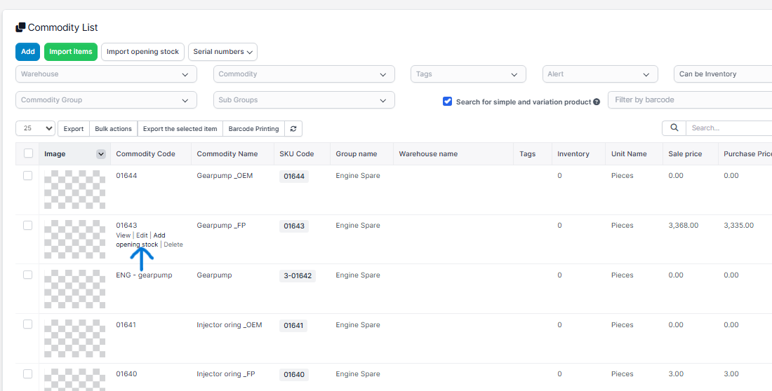 Commodity code - Write the first 3 letters of Commodity group, for example Engine spares as ENG then add the Part name or item name . ( example- ENG- Pushrod valve ,then add same name ( pushrod valve ) in commodity name )