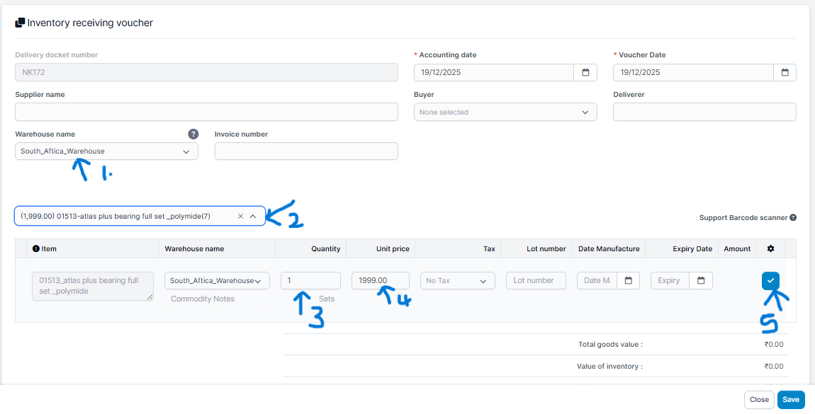 Go to Inventory receiving voucher, and click on add docket , then add the item, warehouse, quantity, price etc, and click on black tick mark and save it .